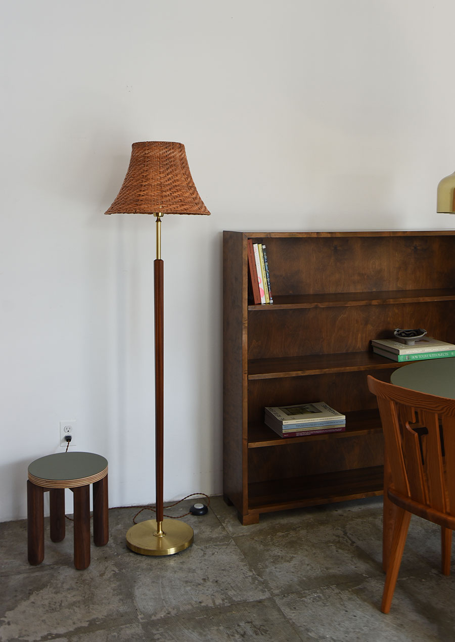 本体は真鍮とマホガニー材の組み合わせ、シェードはラタン編みのヴィンテージシェードです。