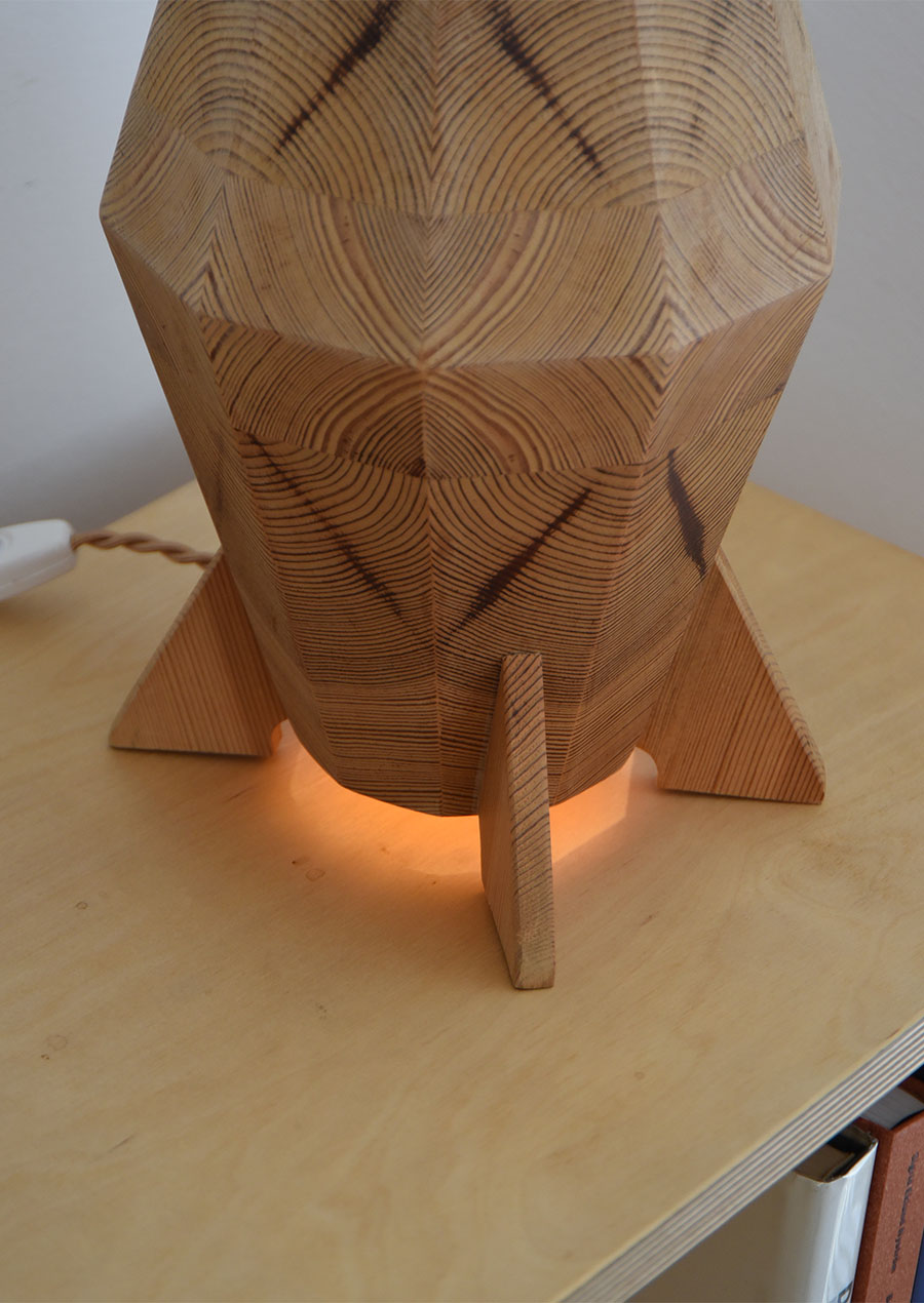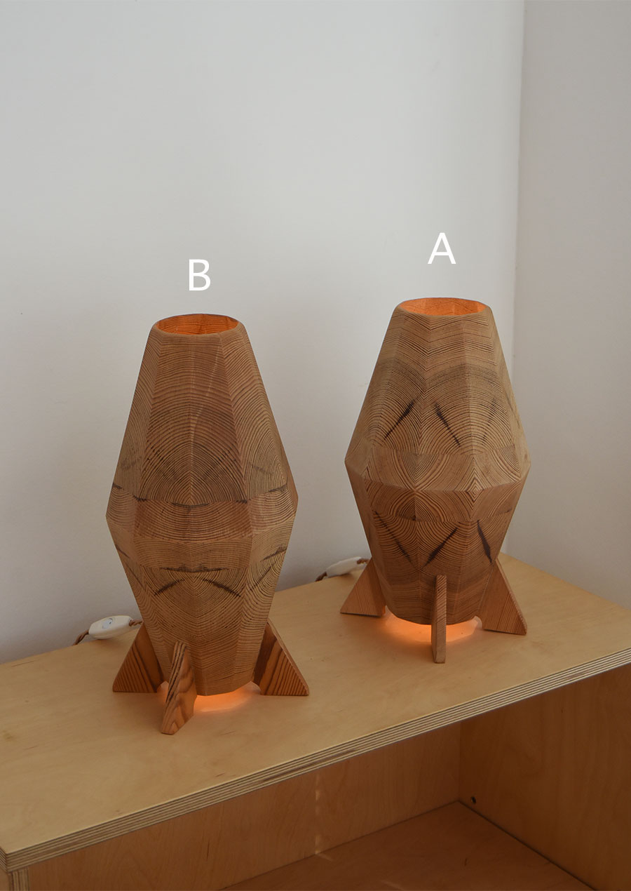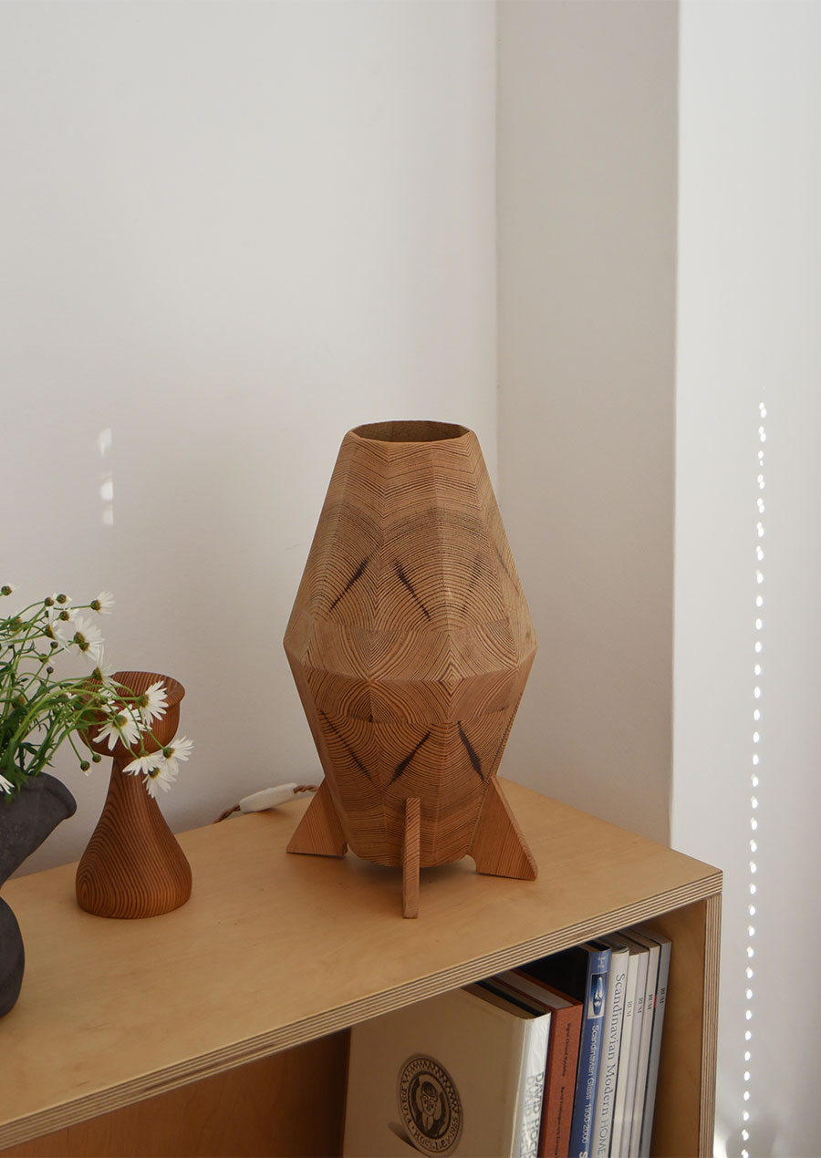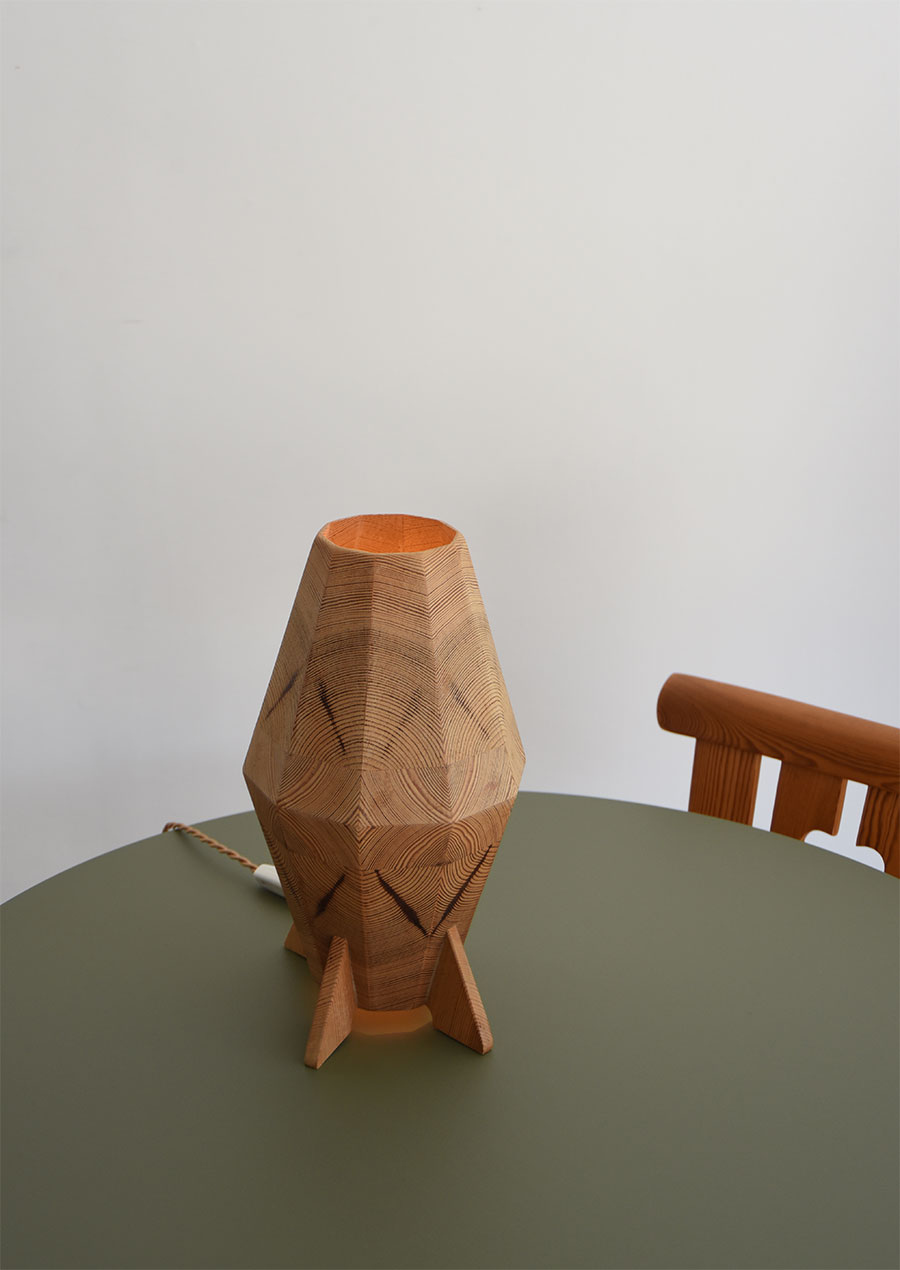 こちらのようなパイン材を薄くスライスし寄木にしたデザインのランプは、