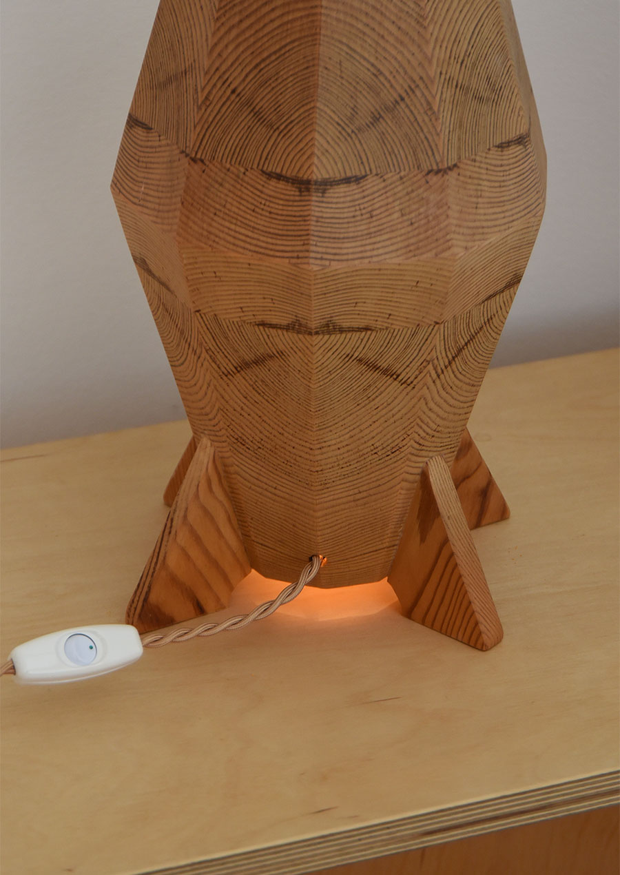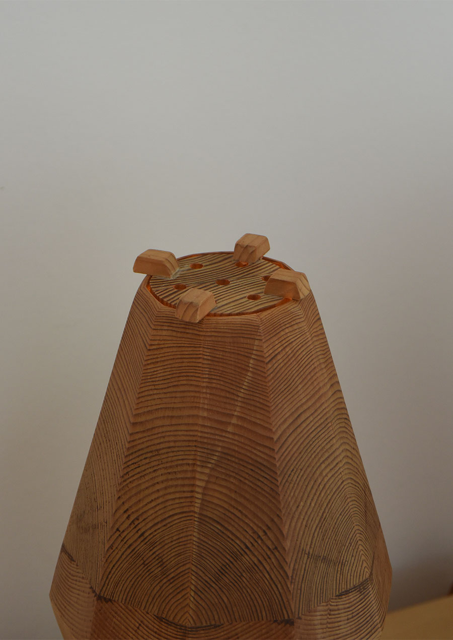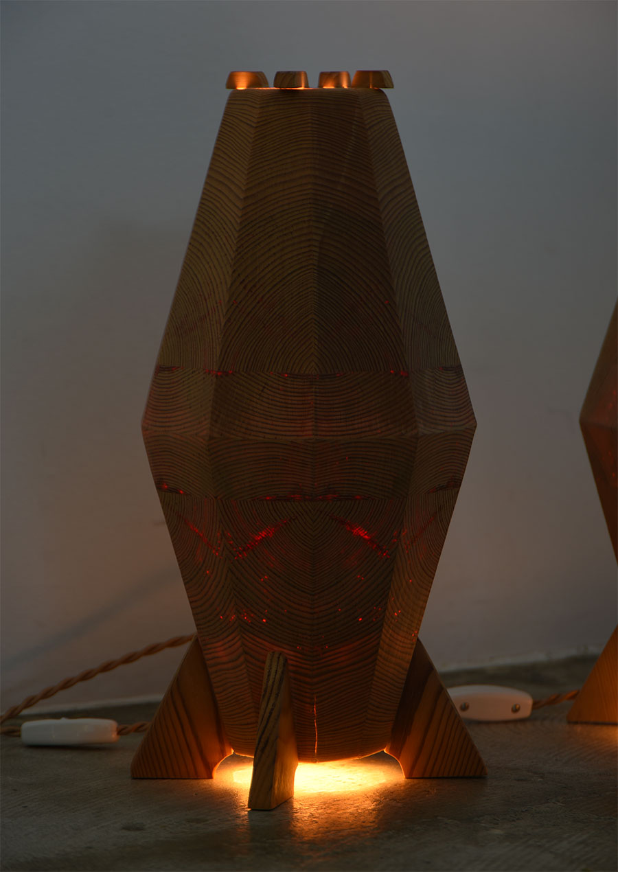 点灯するとパインの木目がぼんやり赤い光を放ち、昼間とは異なる幻想的な雰囲気です。