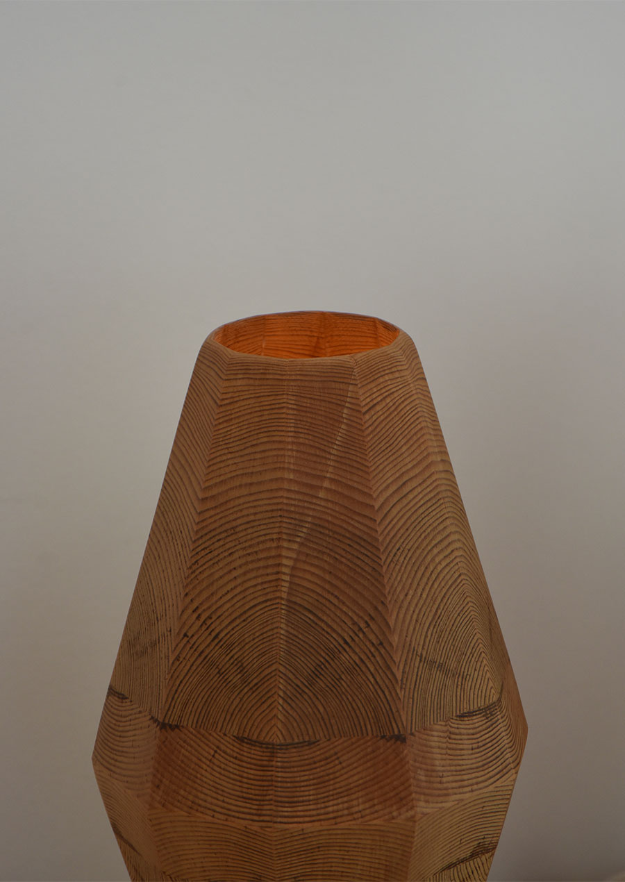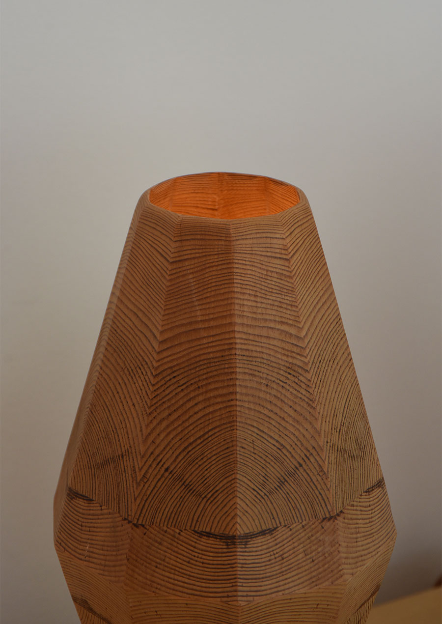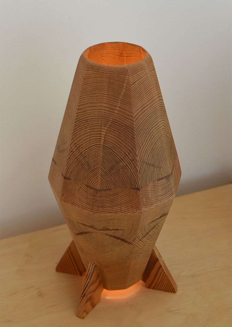 点灯するとパインの木目がぼんやり赤い光を放ち、昼間とは異なる幻想的な雰囲気です。