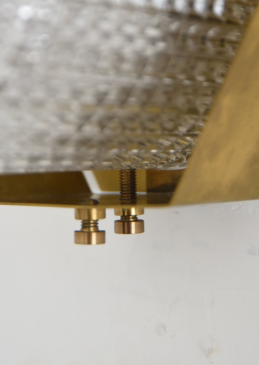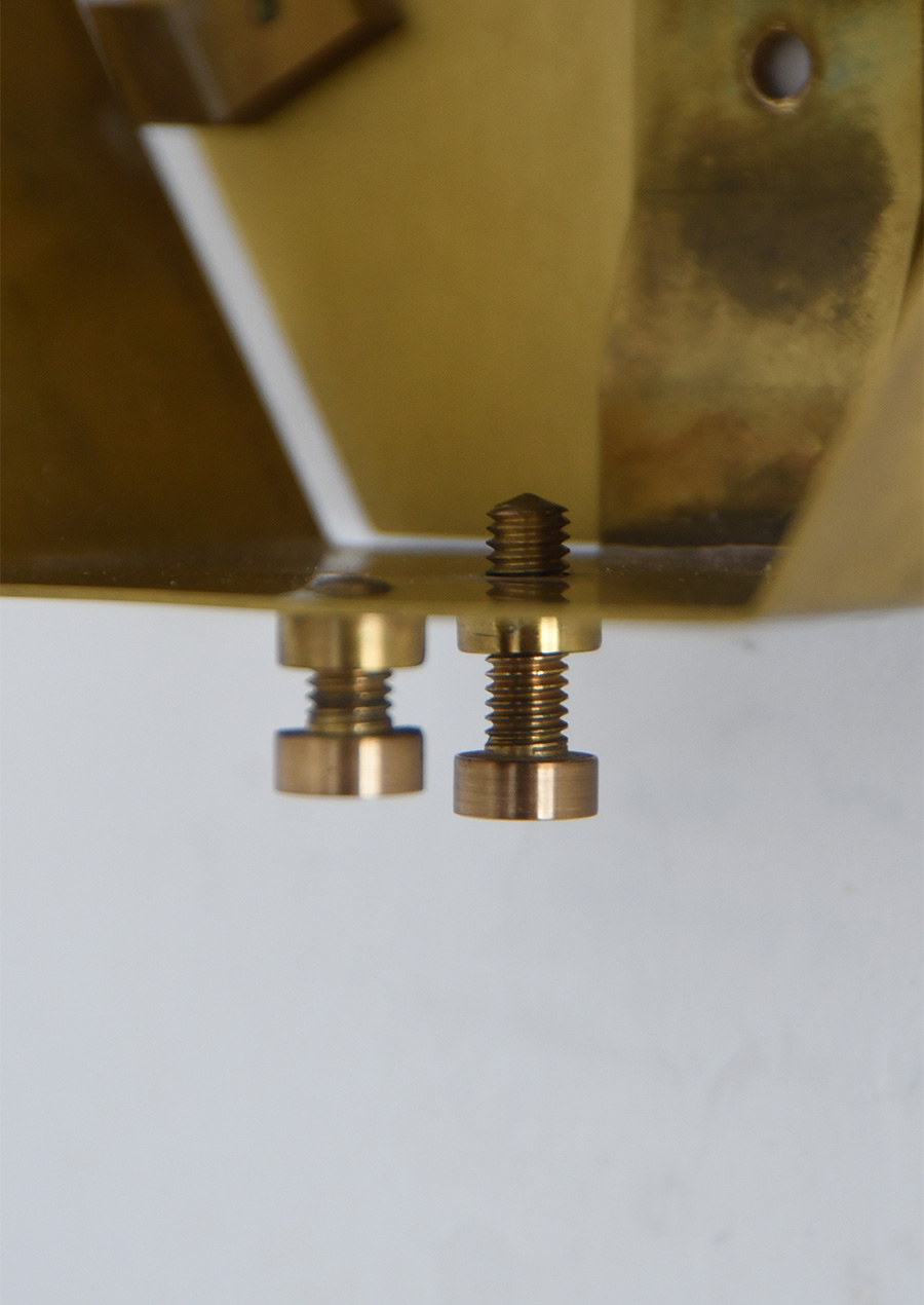 最後にグリーンガラスのシェードを差し込み、今度は手前側の真鍮ネジを締め付けて固定します。