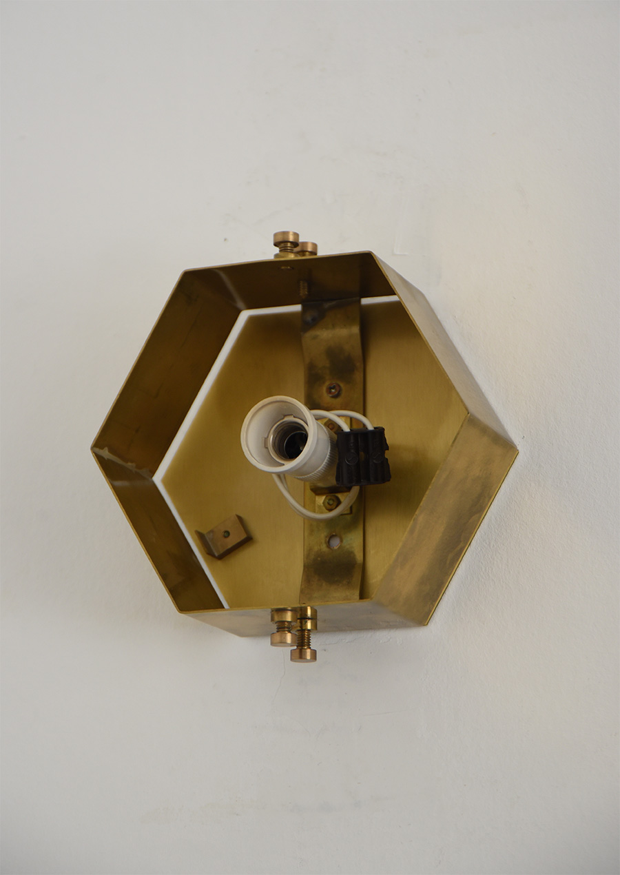 まず、ベースとなる六角形の真鍮フレームを壁にビスで固定します。