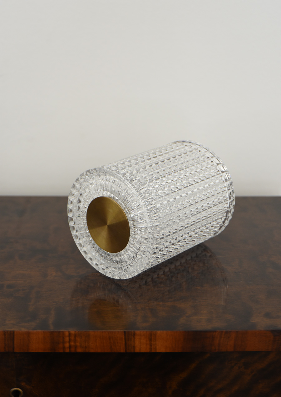 次にクリアガラスのシリンダーをハメ込み2本並んだ奥側の真鍮ネジを上下締め付けて固定します。