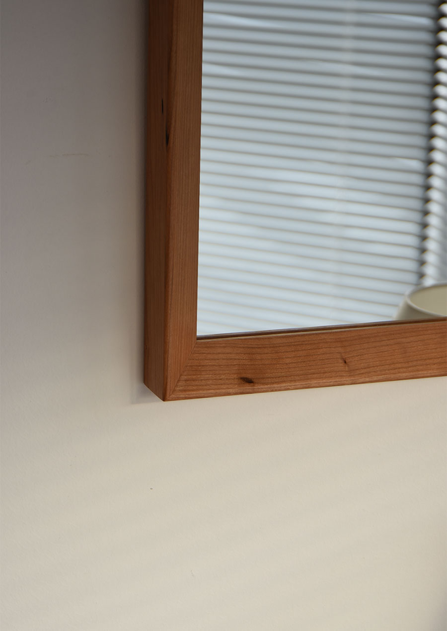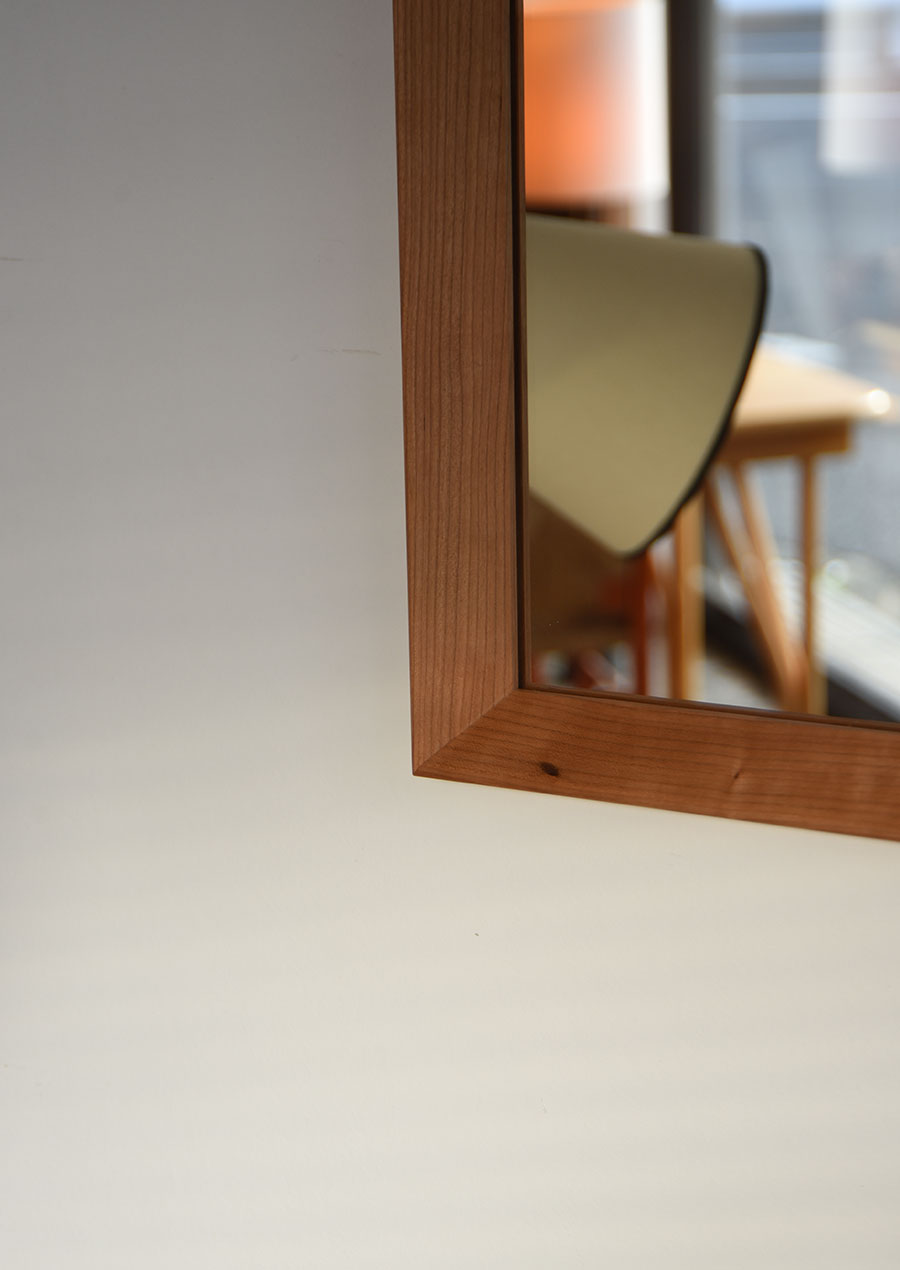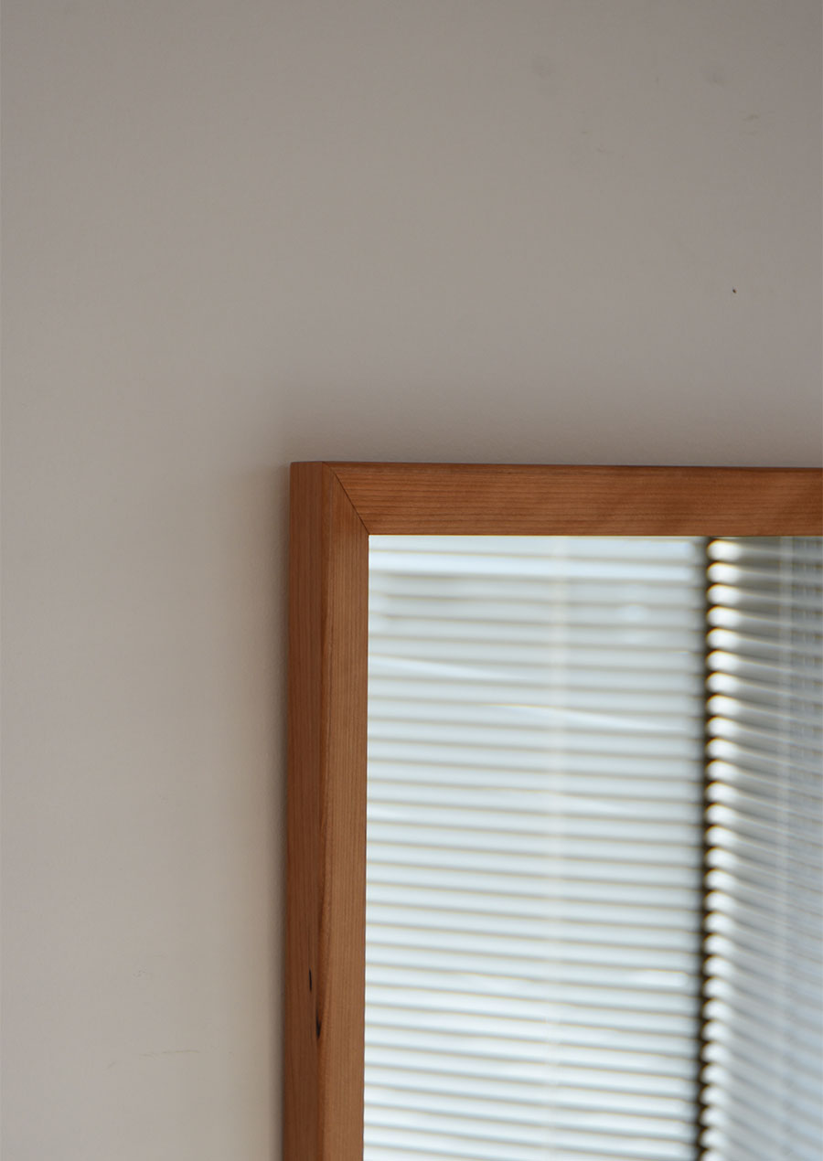 フレーム内側を大きく斜めに切り落としたシャープなデザインで、オリジナルの姿見も同じデザインで製作しています。