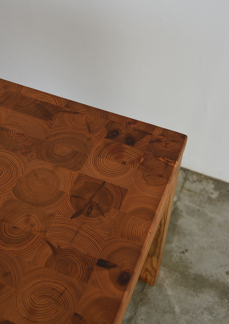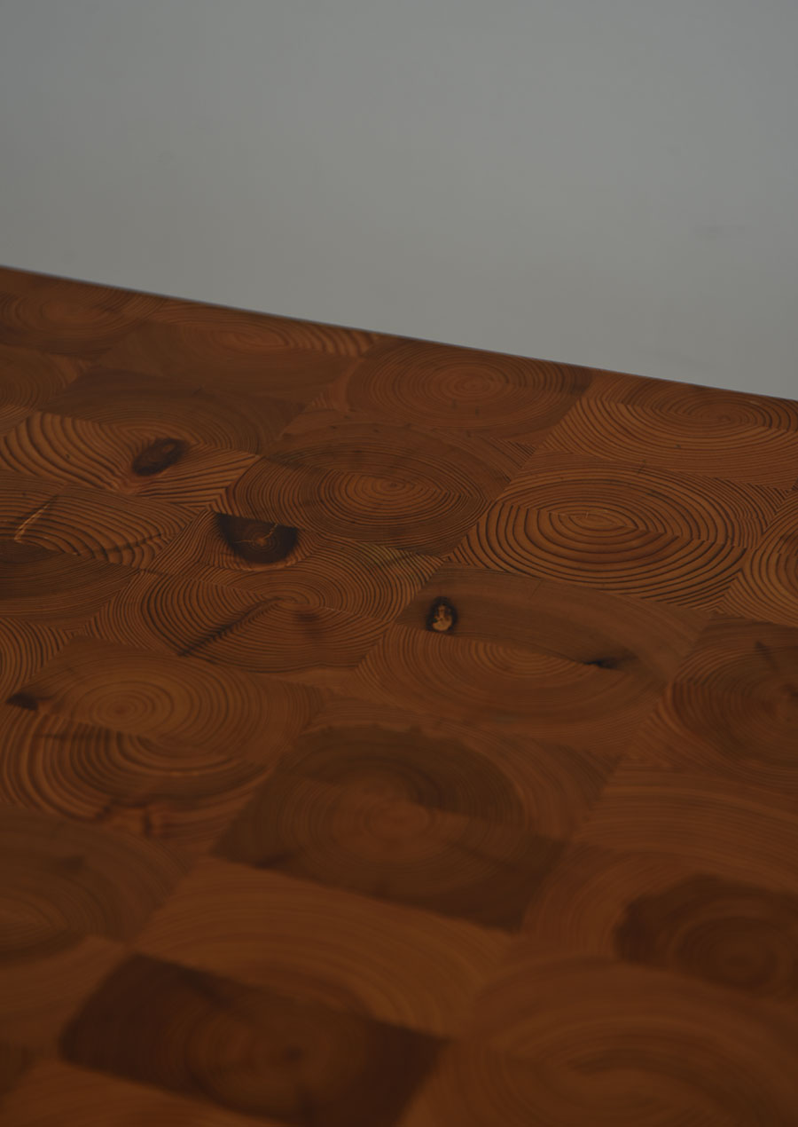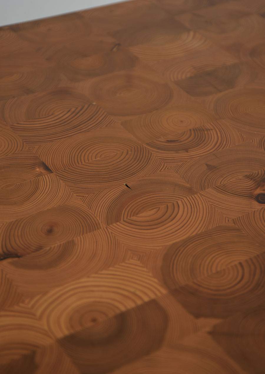 角材の切断面(木口)を上にして並べ、接着して板状に仕上げています。
