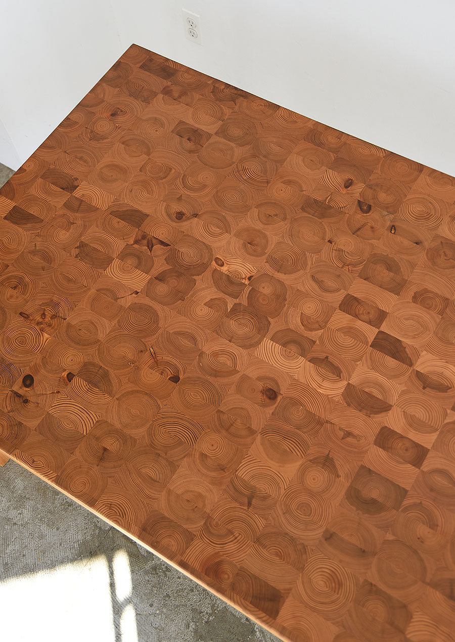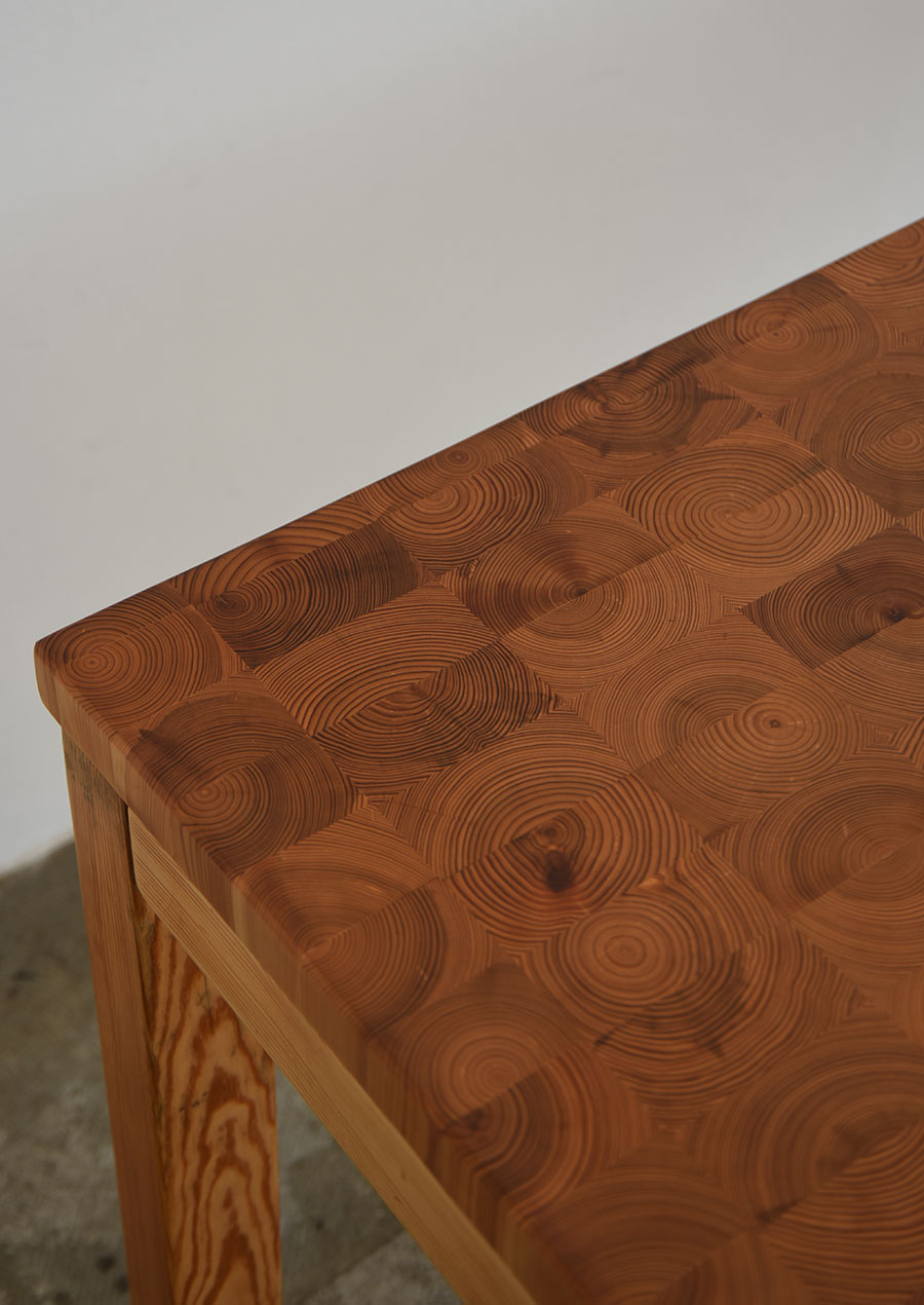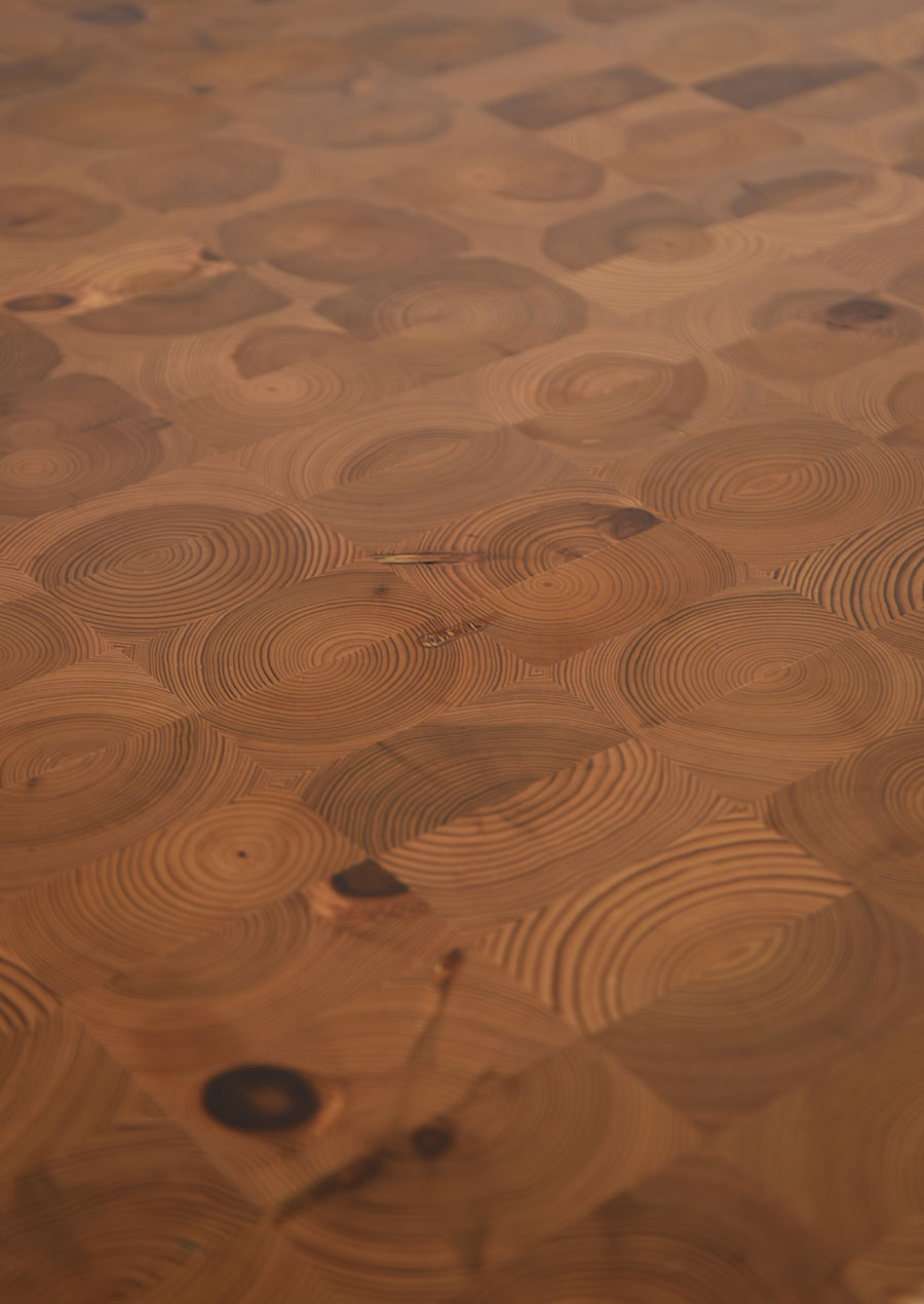 角材の切断面(木口)を上にして並べ、接着して板状に仕上げています。