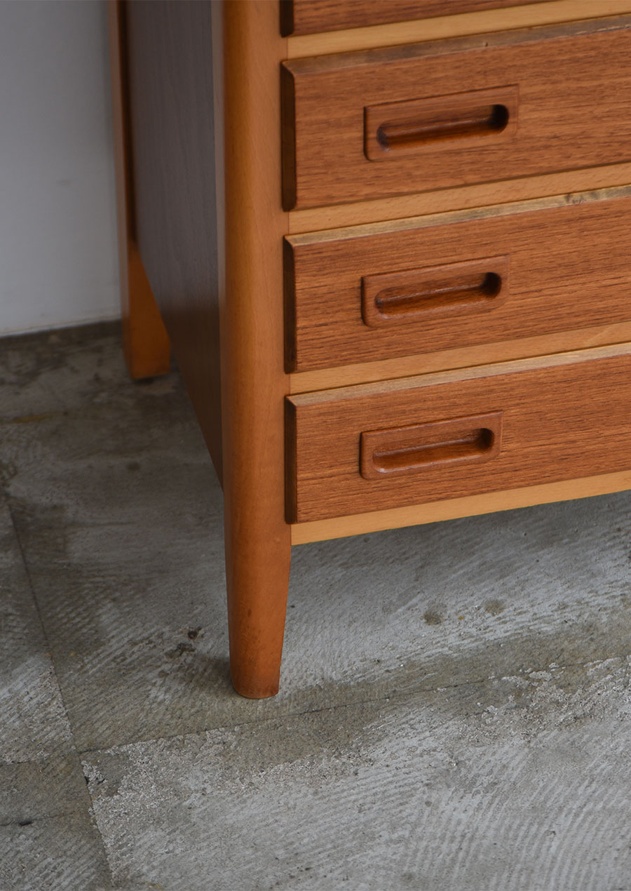 引き出し前板はチーク材、脚はビーチ材、側面板もおそらくビーチ板目の化粧板だと思いますが、