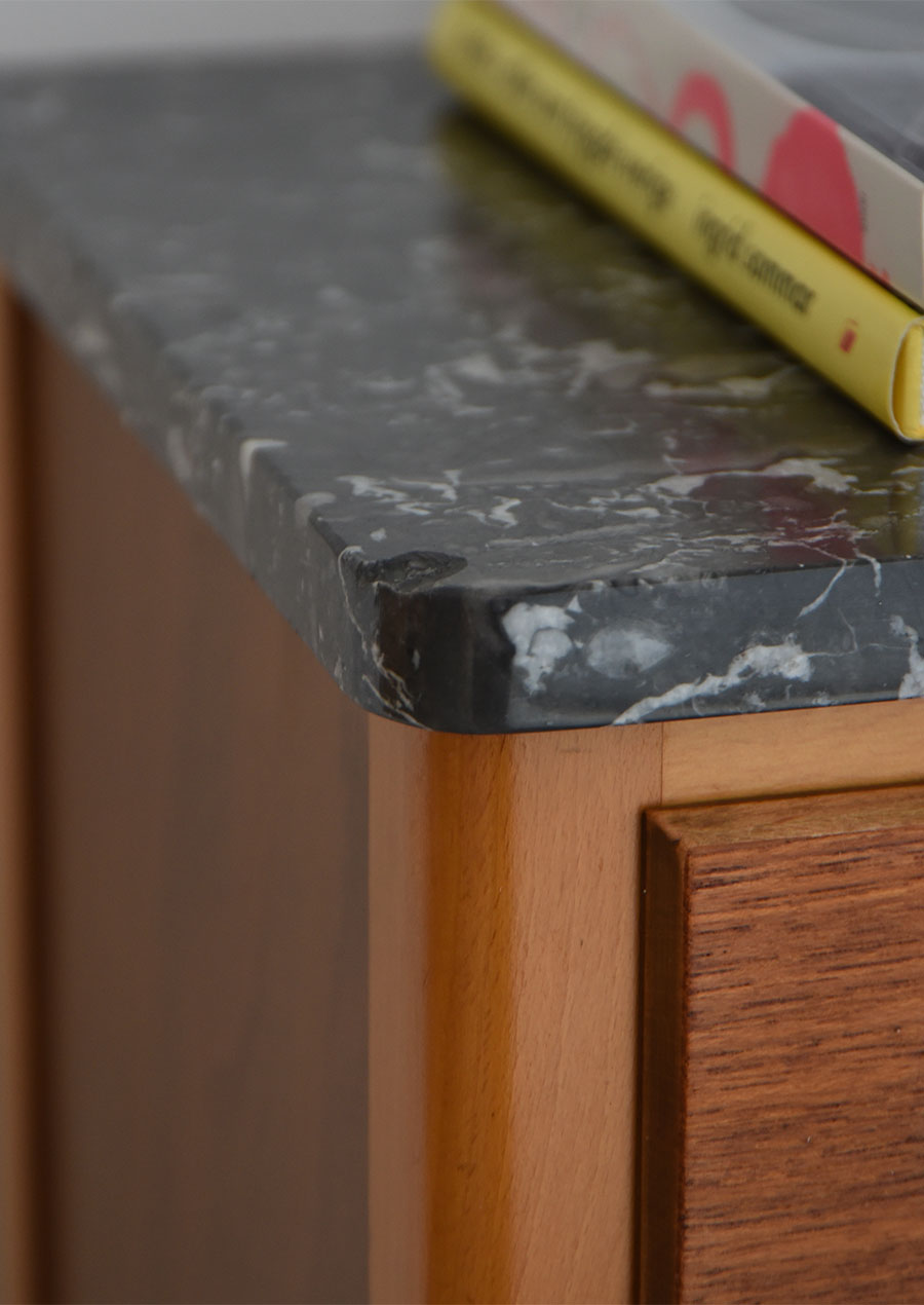 天板の大理石も合わせたら、この小さな家具の中に4種類もの素材が使われています。