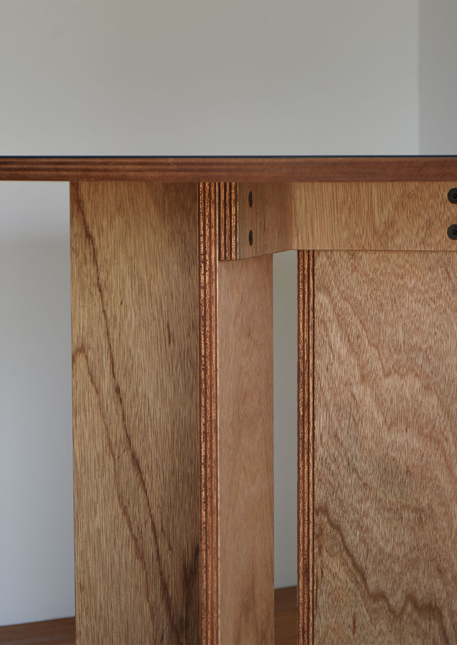 テーブルは六角レンチで組み立てができ、また1枚の合板から製作出来るよう材料効率も考えています。